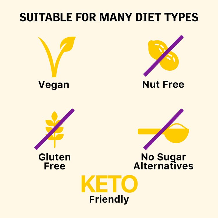 Keto friendly, Plant Based & Vegan, Gluten Free, Nut & Peanut Free.