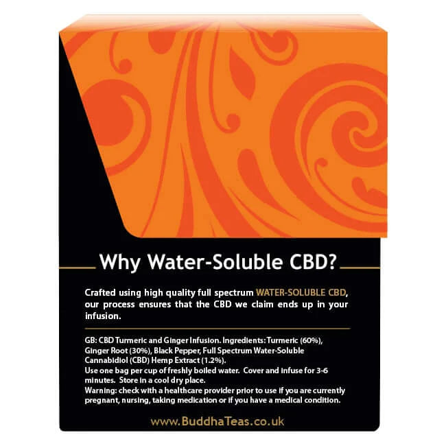 Turmeric and ginger blend naturally with 5 mg of water-soluble CBD in this pure, organic infusion. Free from chemicals and preservatives, it offers a warm, soothing tea with zero THC, combining traditional roots with modern benefits.